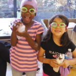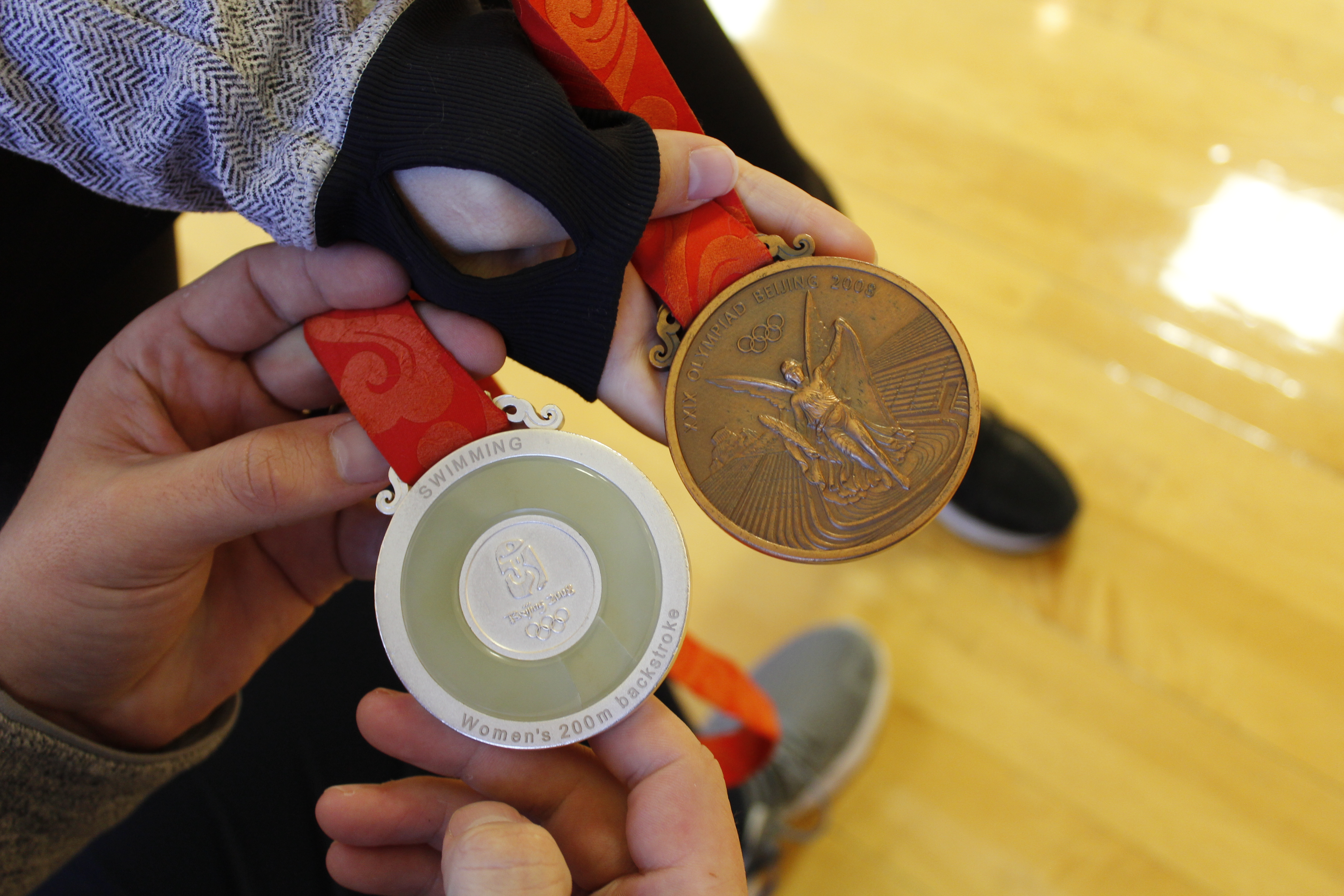 - Children hold two of the Olympic medals won by guest speaker Margaret Hoelzer at the 2019 Swimming With Inspiration and Motivation clinic.